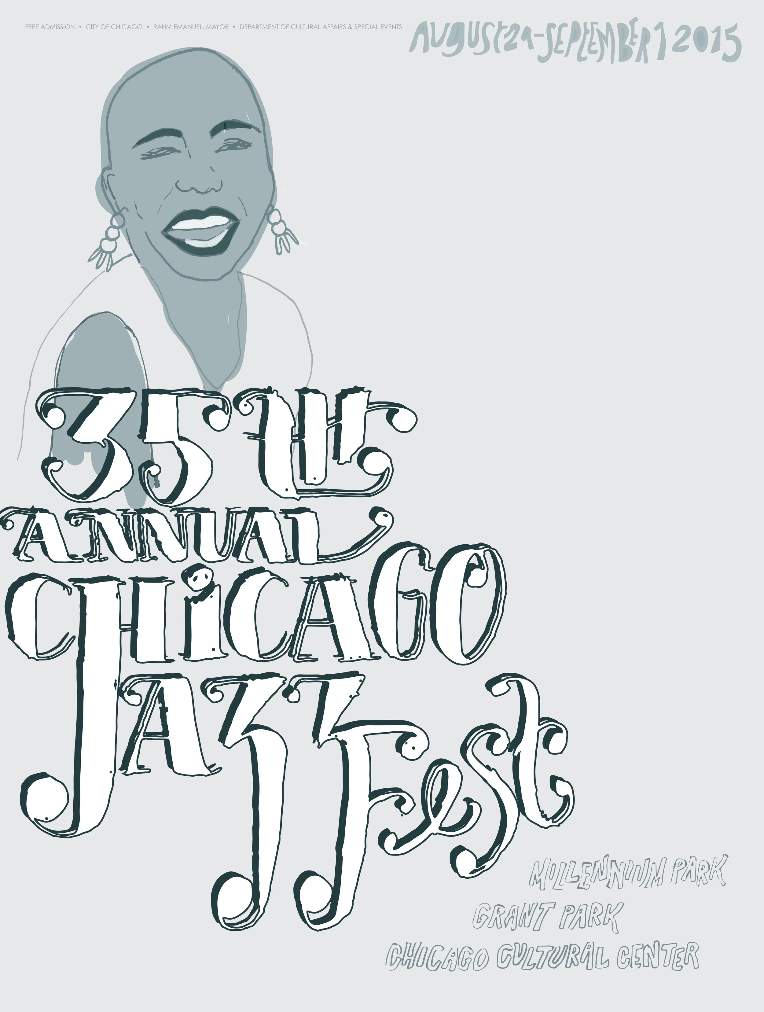 This poster was created as a departure from traditional jazz signage. The design incorporates hand-drawn type and illustrations that aim to convey a more whimsical feel. Acknowledging the potential for a poster series, this specific design features one of the many artists that performed at the Chicago Jazz Festival.
